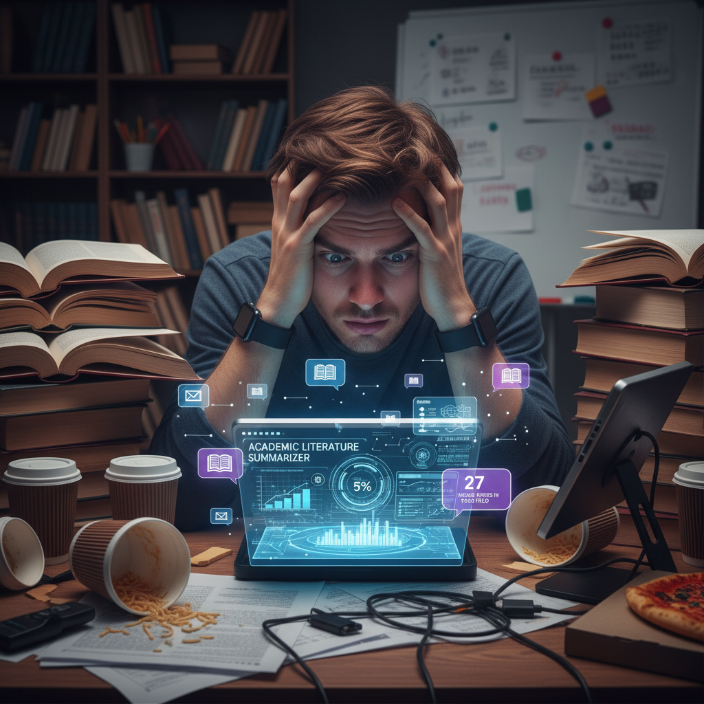 Overwhelmed researcher facing academic literature overload, representing the struggle of using AI summarizer tools for endless research papers.