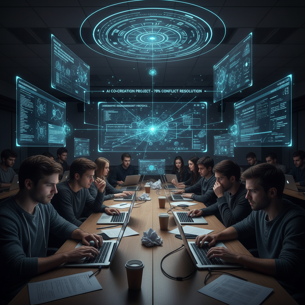 University seminar room with students collaborating over AI summarizer tools, highlighting the tension between efficiency and academic rigor.