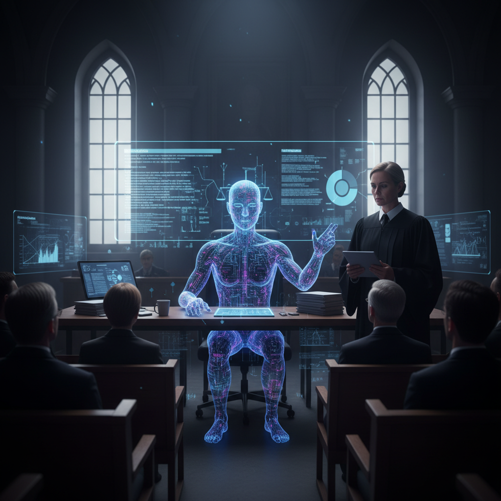 Alt text: AI algorithm as a digital judge analyzing document investigation files in a dramatic courtroom scene.