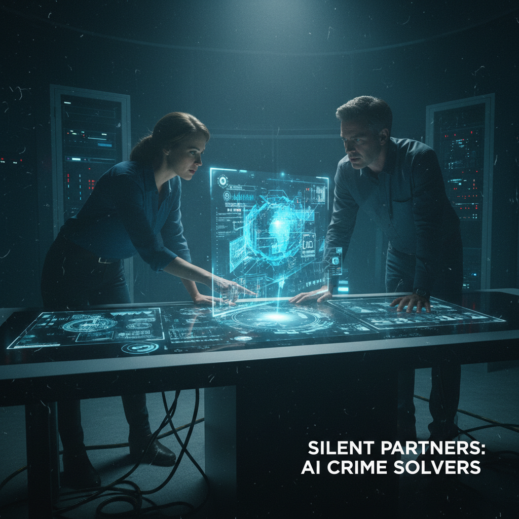 Alt text: Investigators collaborating with AI document investigation systems in a tense, high-stakes environment.