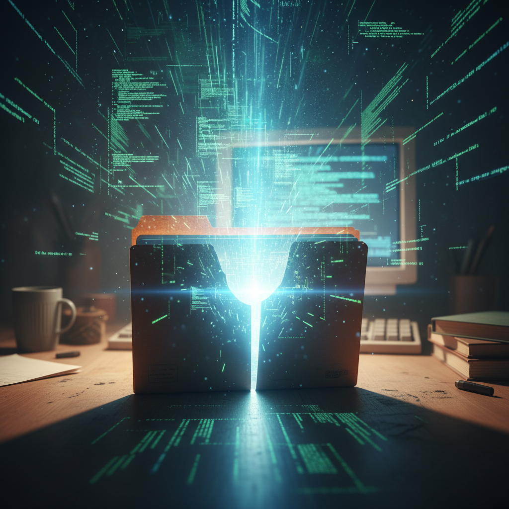 Alt text: Open AI document investigation folder with light streaming out, symbolizing actionable insight surrounded by code.