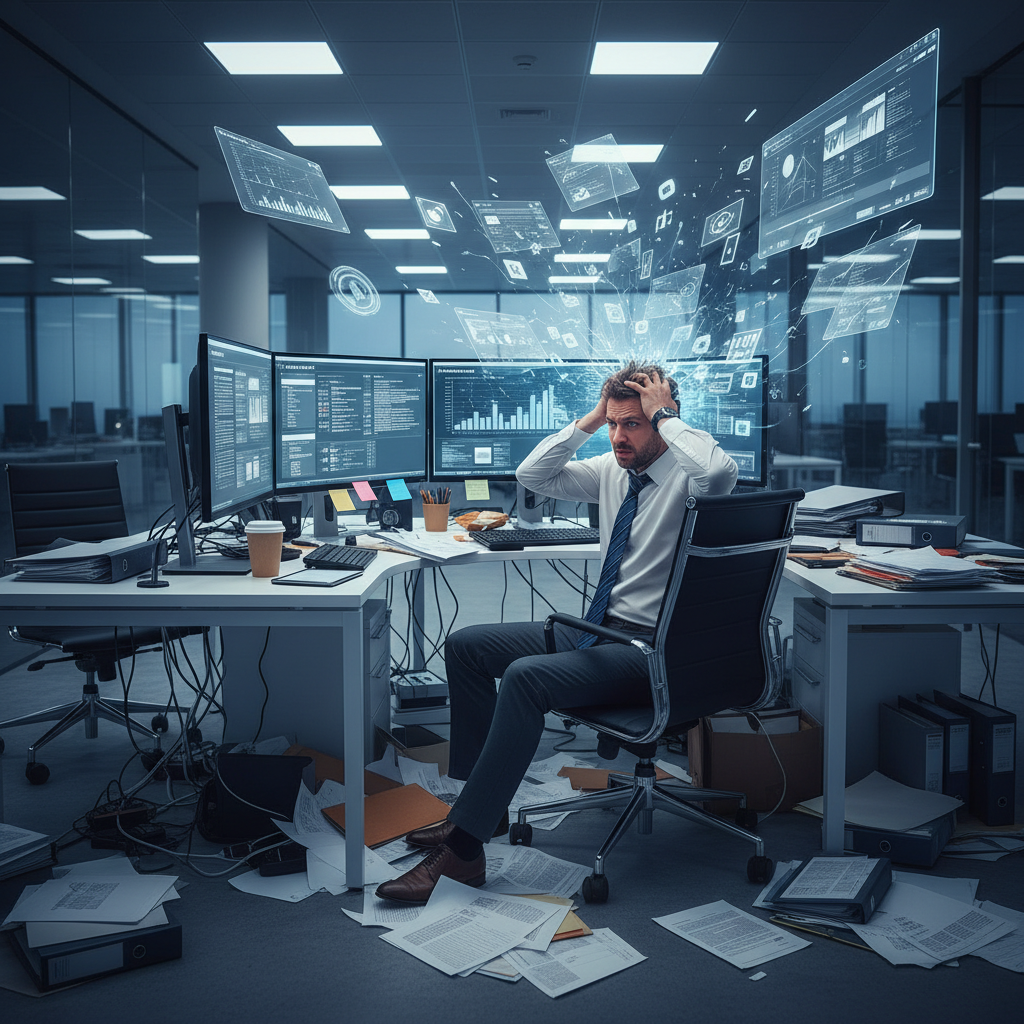 Alt text: Overwhelmed office worker surrounded by AI document investigation and analysis files in a modern, stressed workplace.