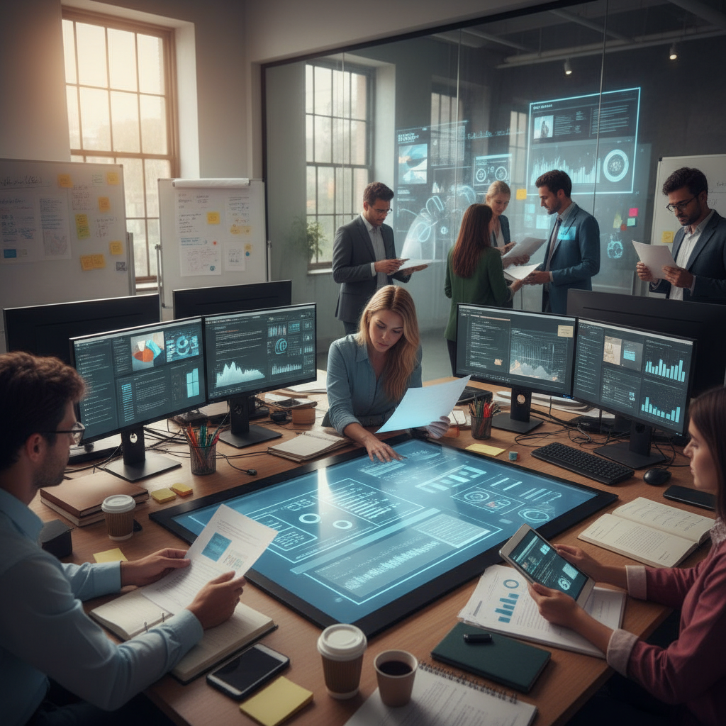 Alt text: Hybrid document analysis team with AI interface on screen, human reviewers collaborating, keywords: hybrid document analysis, automation, in-house.