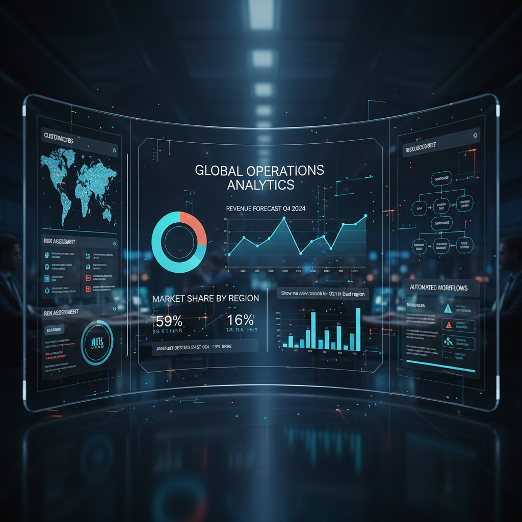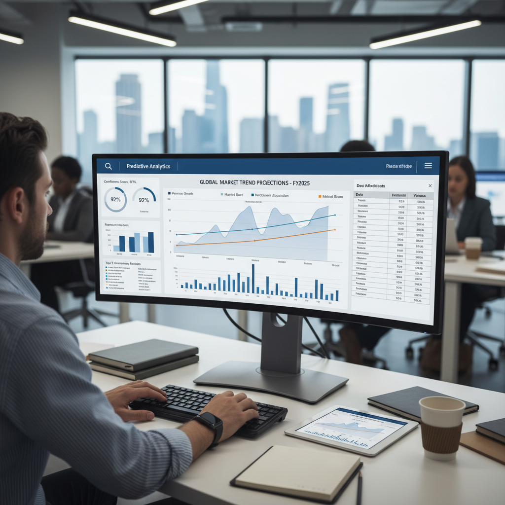 Photo: Analyst at digital dashboard with predictive trend graphs, illustrating the evolution from automation to actionable foresight.