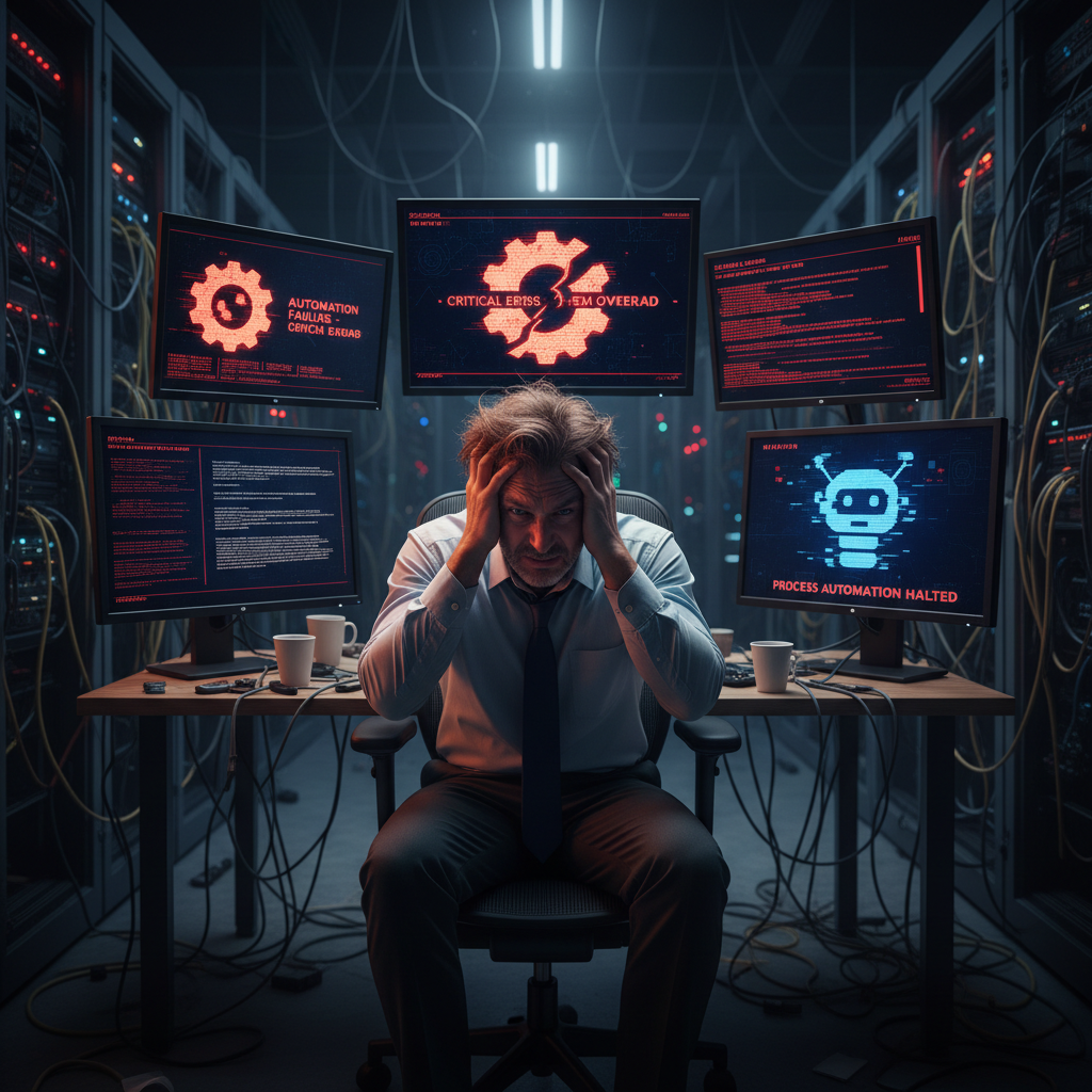 Photo: IT professional surrounded by screens displaying error messages, symbolizing real-world automation disasters.