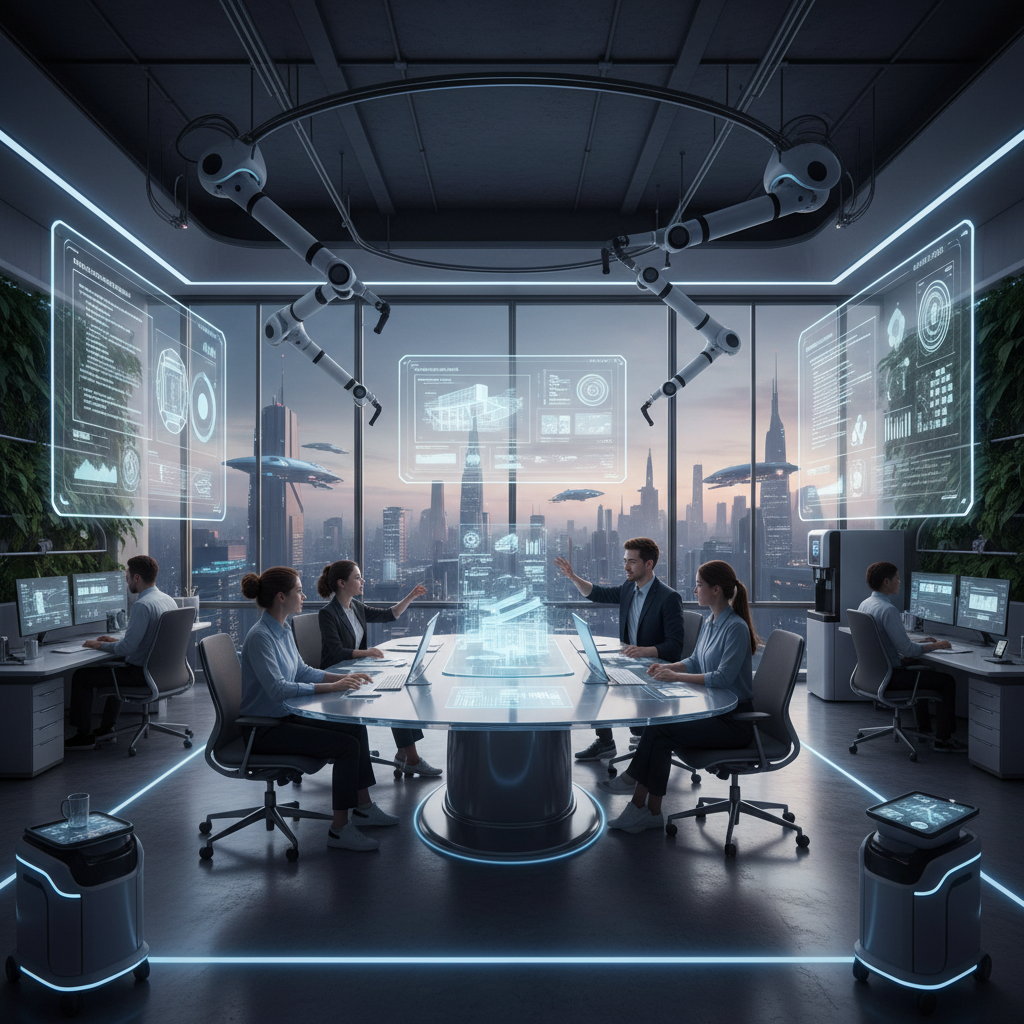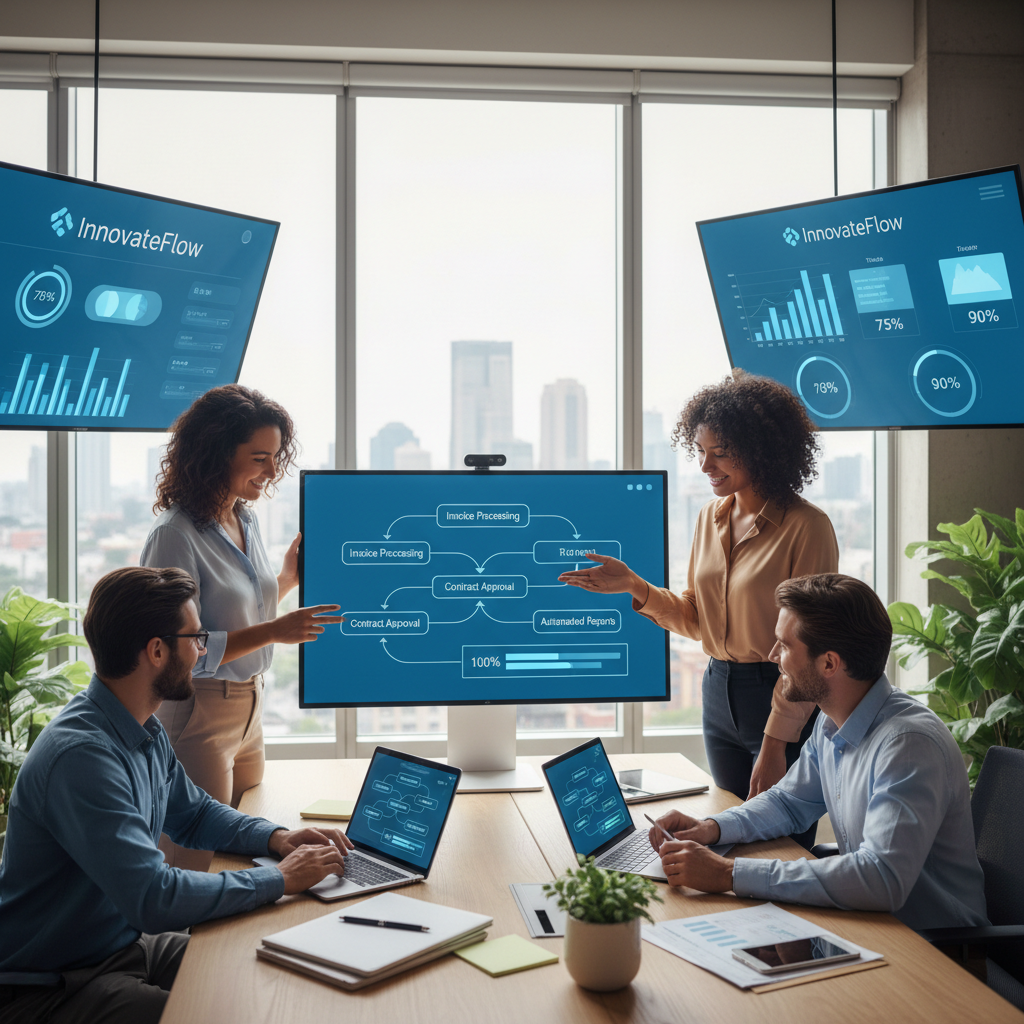 Photo: Team collaborating with digital documents and screens displaying data flows and AI icons, representing the new era of business automation.