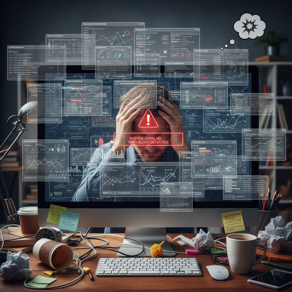 Alt text: Frustrated user faces bloated document analyzer dashboard with excessive toggles, illustrating pitfalls of poorly chosen features in customizable document analyzers