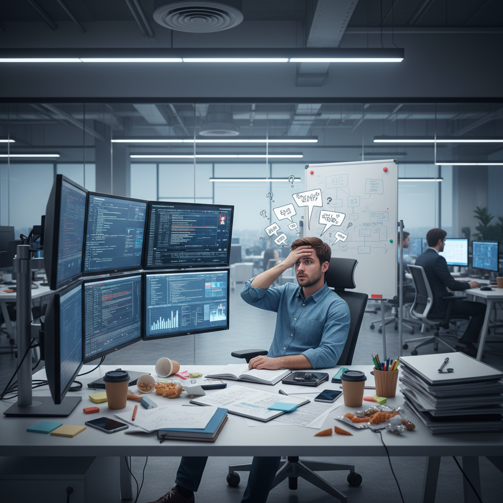 Alt text: Overwhelmed analyst facing information overload in modern office surrounded by digital and paper documents, exemplifying the need for the best customizable document analyzer