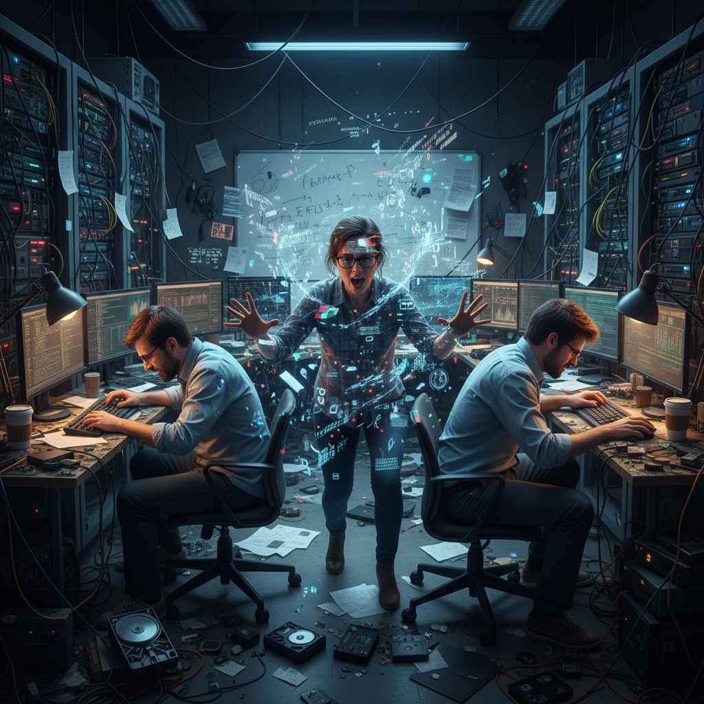 Alt: Analysts grappling with chaotic data extraction tasks in a high-pressure office, illustrating the challenges of modern extraction.
