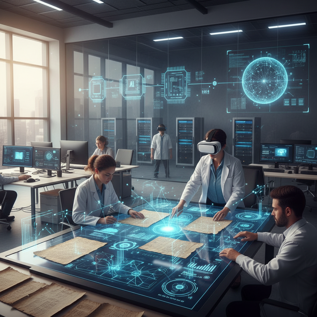 Editorial photo dramatically illustrating the evolution from paper to advanced AI in document analysis decision-making.