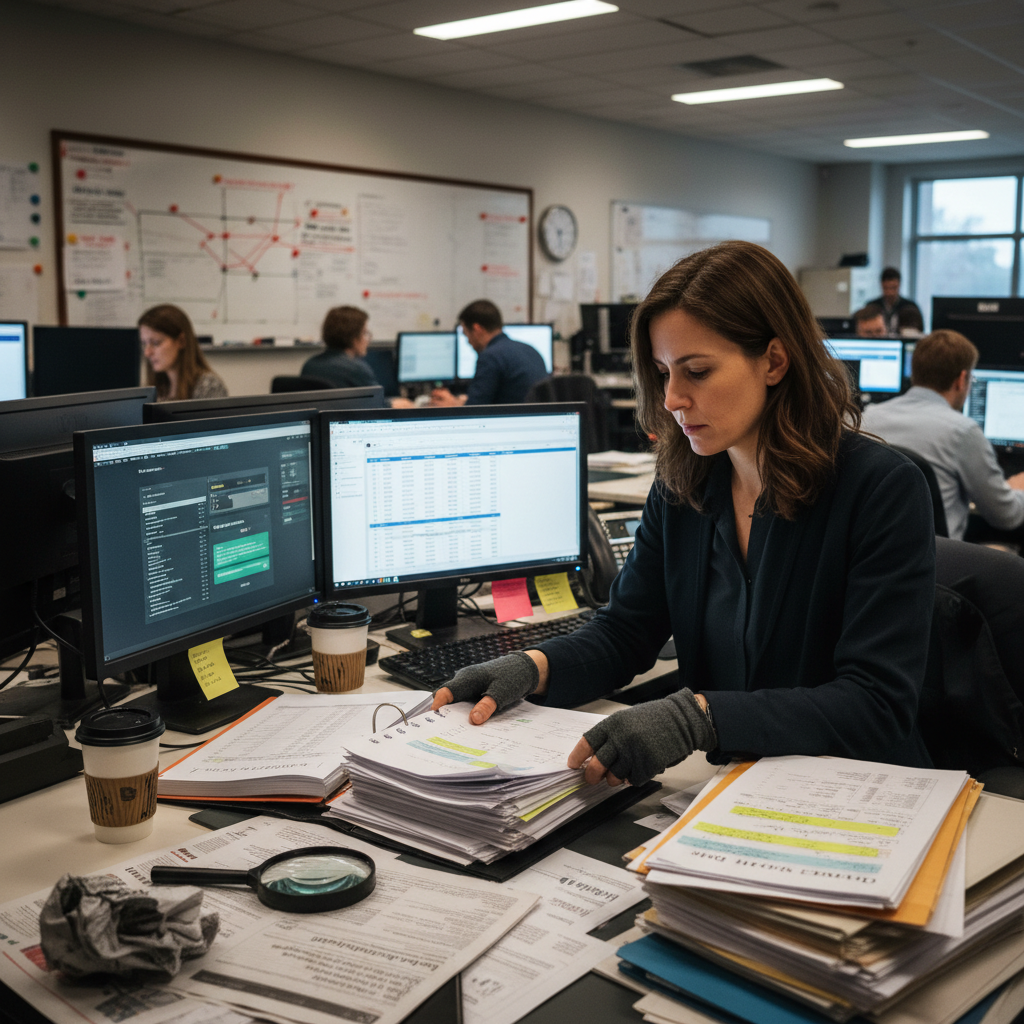 Captured moment of a document analyst grappling with cognitive bias and information overload in a high-stakes environment.