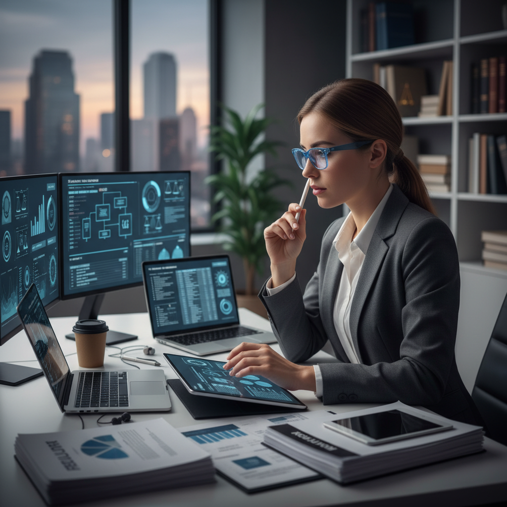 Alt text: Compliance officer analyzing documents with digital analysis tools, demonstrating the human edge in compliance document review.