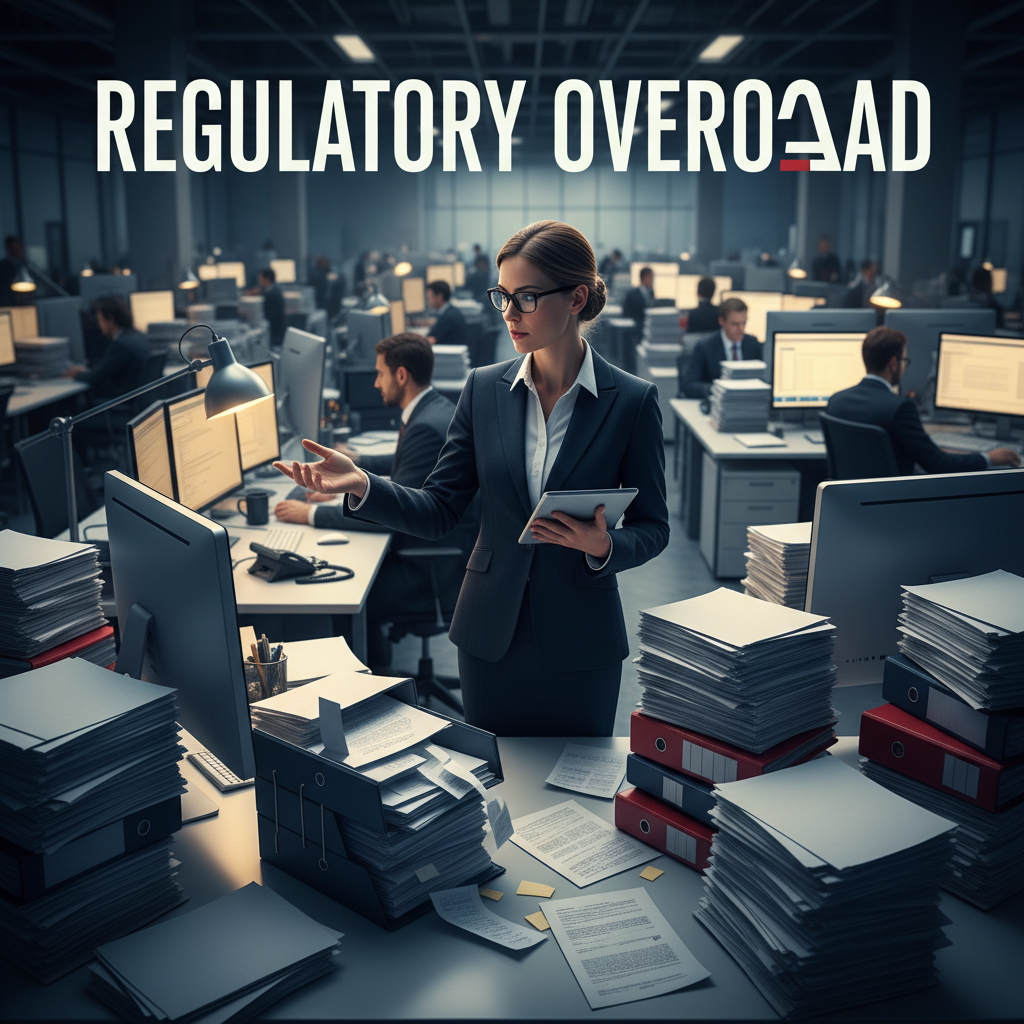 Alt text: Compliance officer overwhelmed by document stacks in a busy office, illustrating document analysis workload.