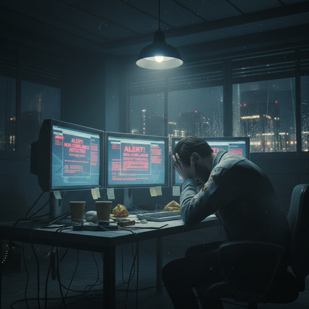 Alt text: Exhausted compliance officer at desk, digital monitors filled with compliance warning alerts, illustrating burnout from document analysis.