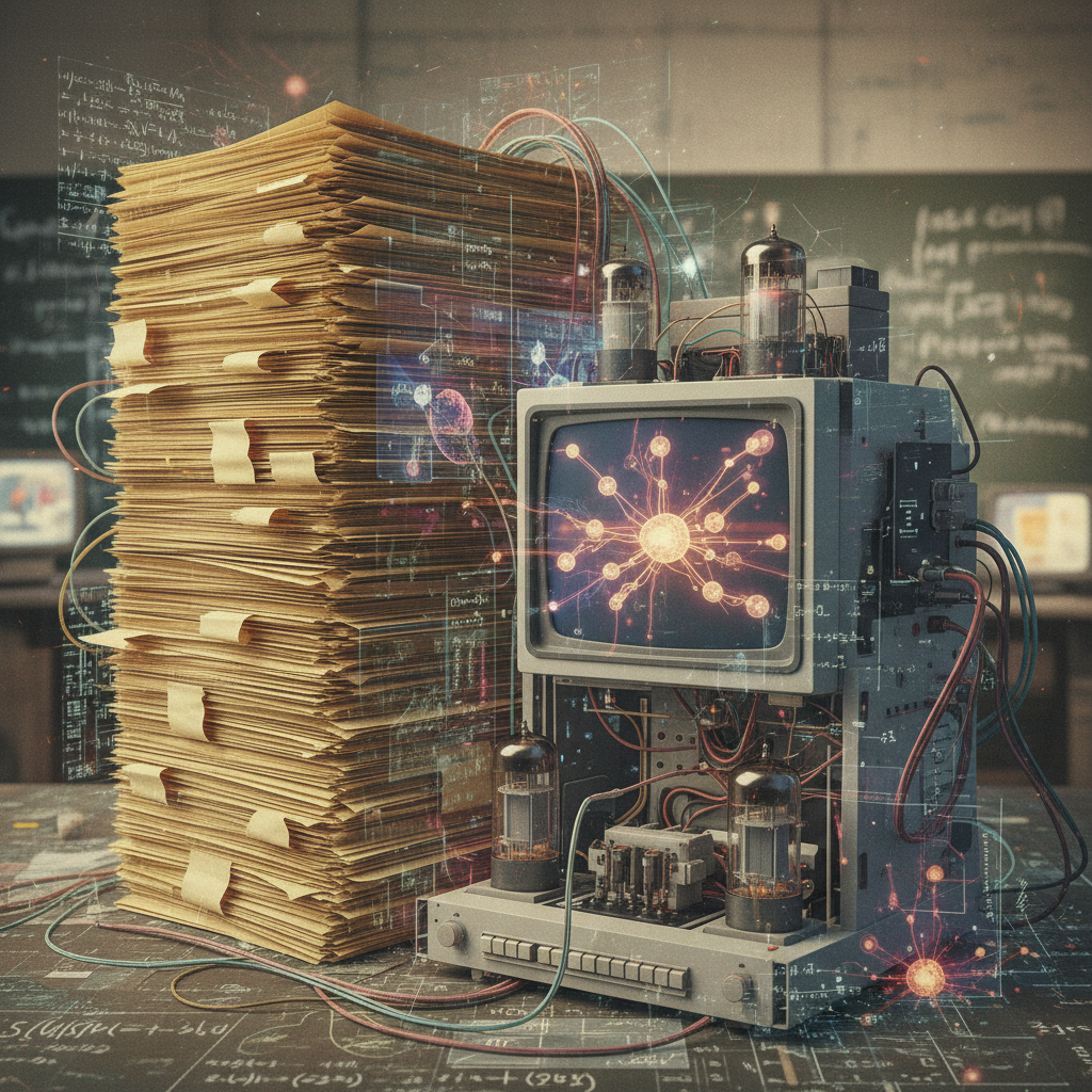 Alt: Historic evolution of document analysis tools, showing paper, early computers, and neural network visualizations
