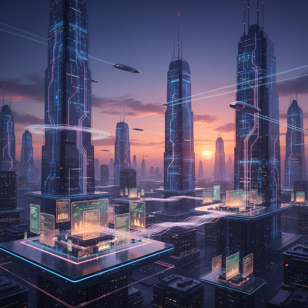 Alt: Futuristic cityscape made of digital documents symbolizing analytics progress and next-gen document analytics technologies