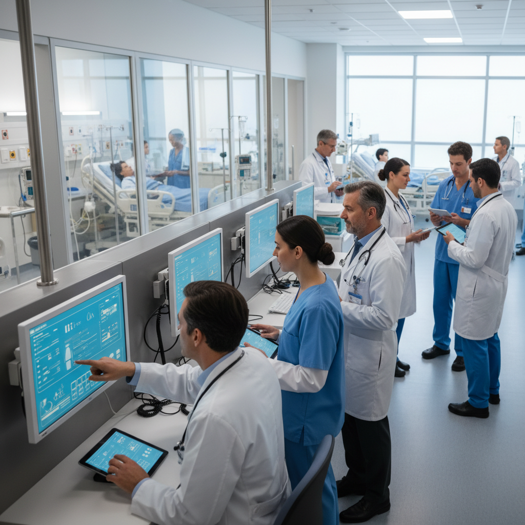 Alt: Doctors using document analytics for patient data in a hospital, showcasing healthcare analytics transformation