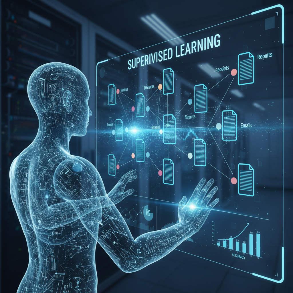 Alt text: Supervised learning in action, showing an AI system labeling digital documents in a business setting.