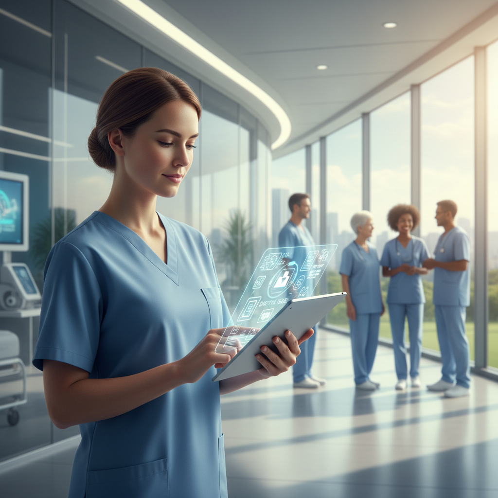Nurse with a tablet reviewing digital documents in a modern hospital, representing document digitization in healthcare