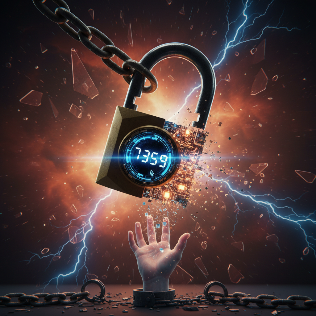 Open padlock made of digital code, symbolizing liberation and risk in document digitization technologies