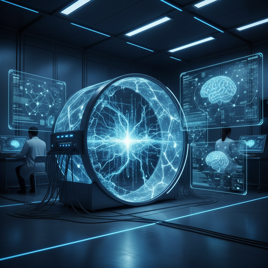 Close-up of a scanner transforming into neural networks, representing advanced document digitization technologies