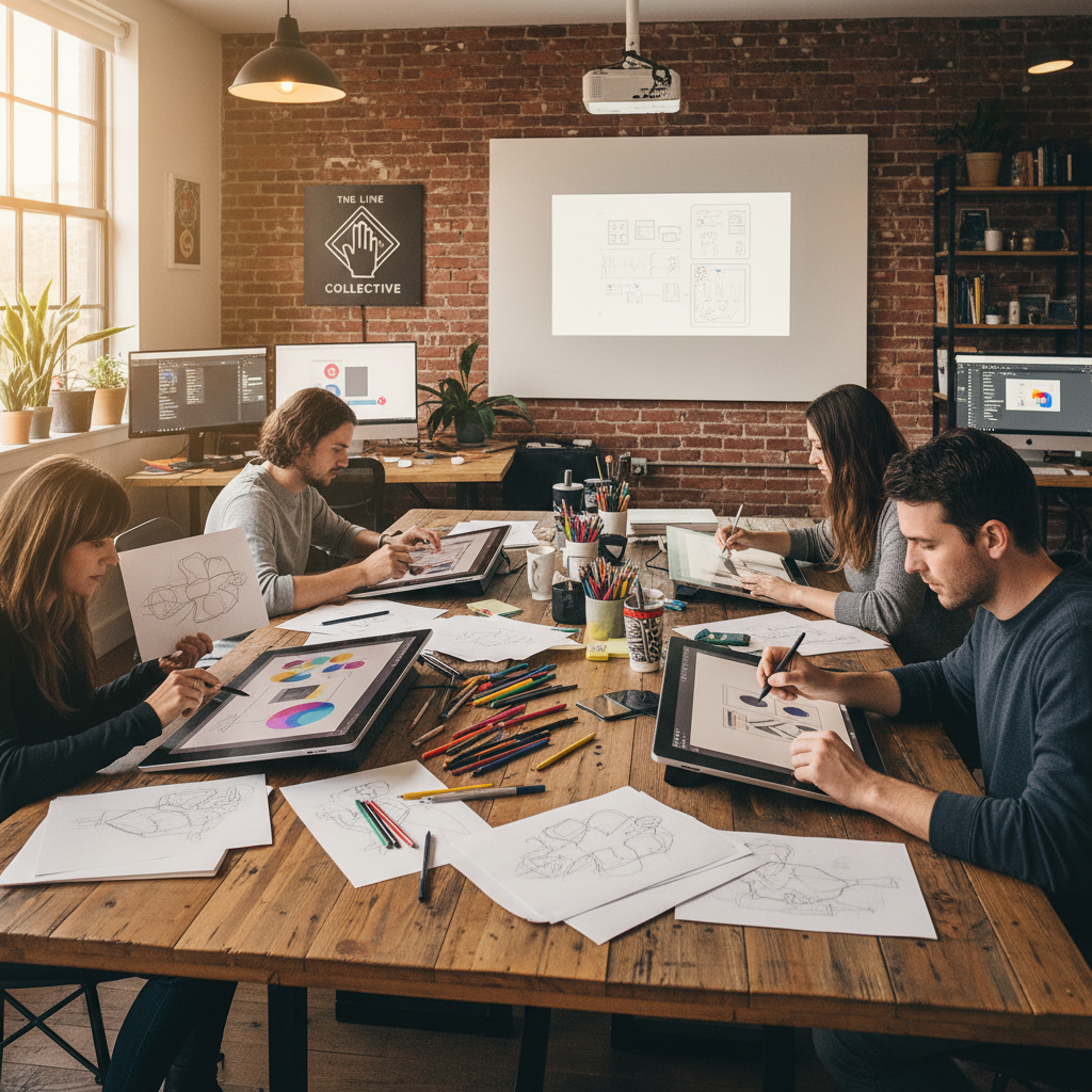 Creative agency digitizing paper sketches with tablets, blending analog creativity with digital archiving—an unconventional document digitization workflow in action.