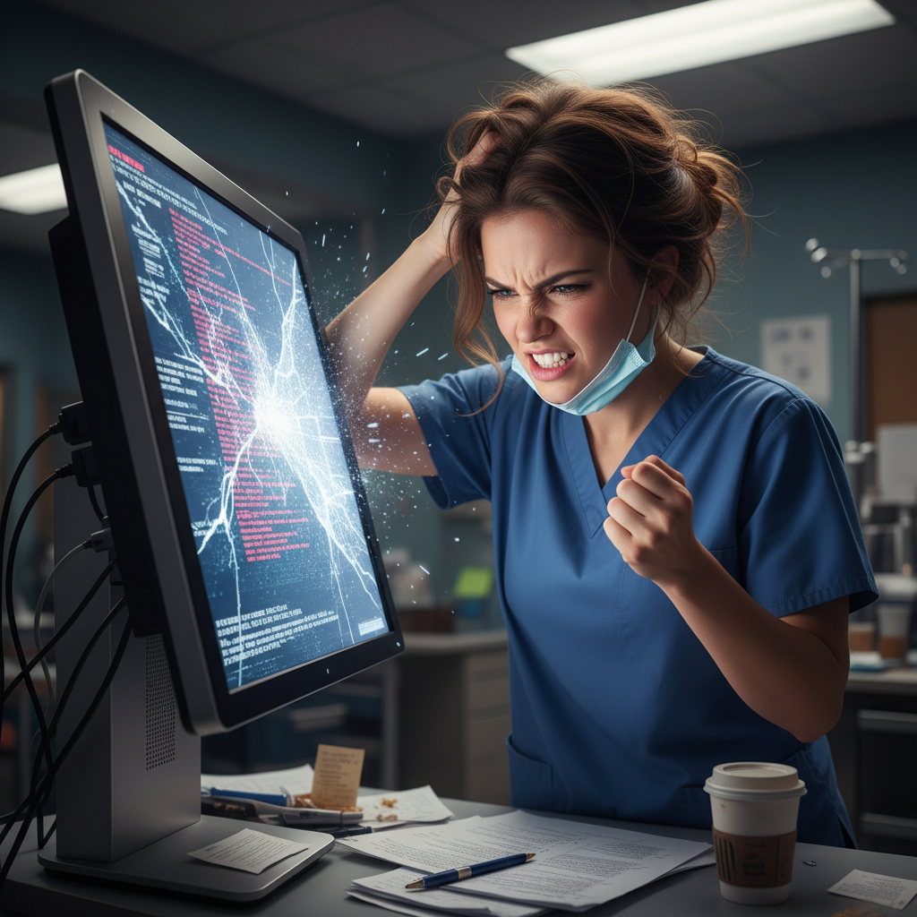 A nurse faces down a glitchy digital terminal—when document digitization workflow goes wrong, patient care is collateral damage.