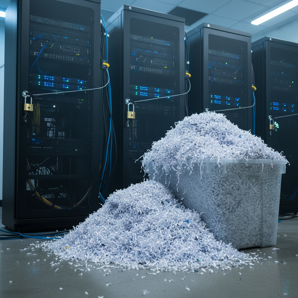 Shredded files beside locked digital storage—one misstep in your document digitization workflow and valuable data is either lost or exposed.