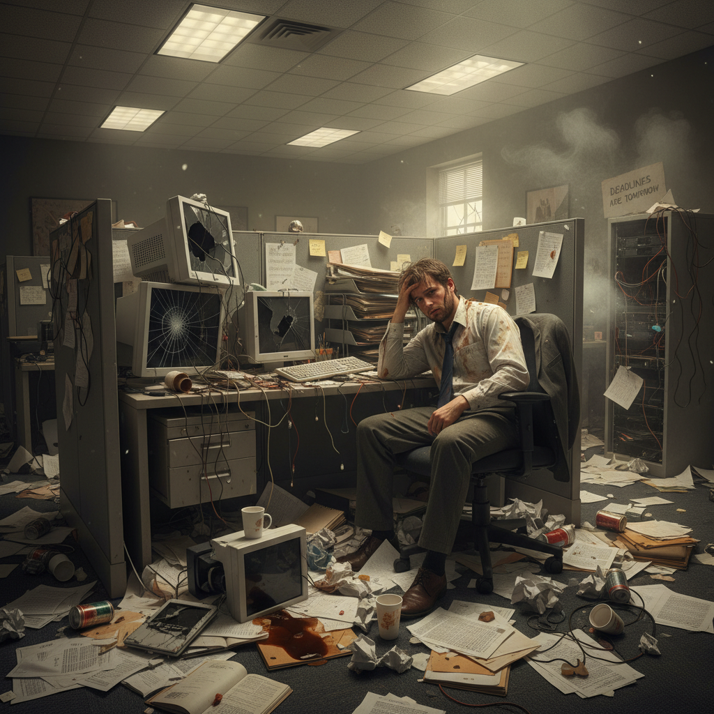 Alt: Stressed office worker overwhelmed by document chaos and failing document scanning solutions comparison setup.