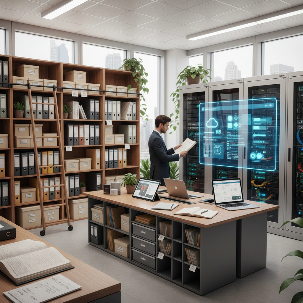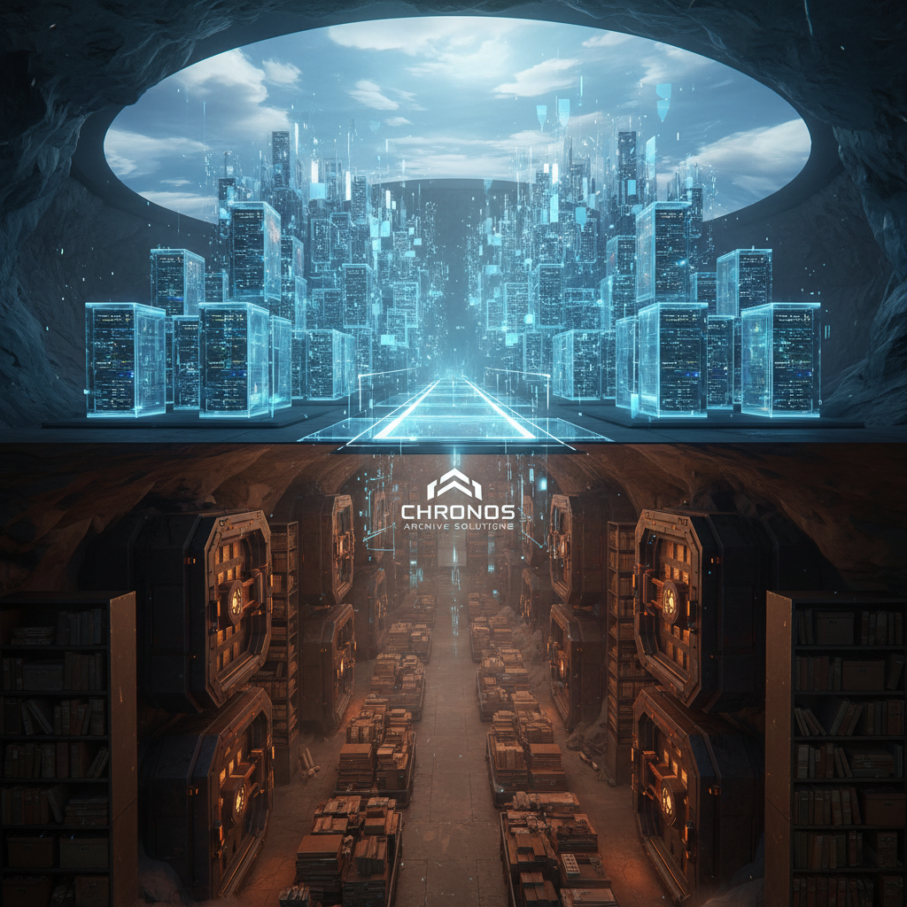 Alt text: Cloud servers contrasted with a paper archive room, highlighting hybrid document storage solutions.