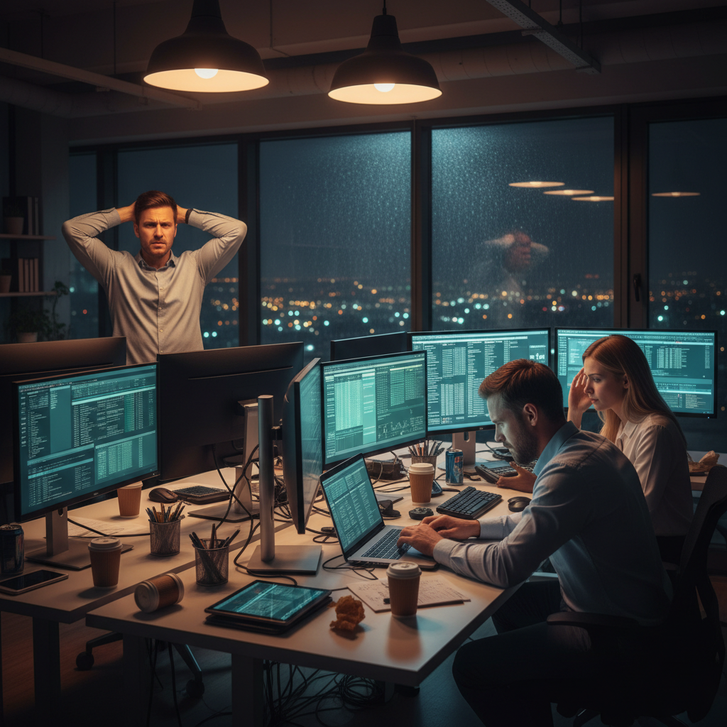 Alt text: Overwhelmed risk managers facing a flood of digital documents, office night lighting