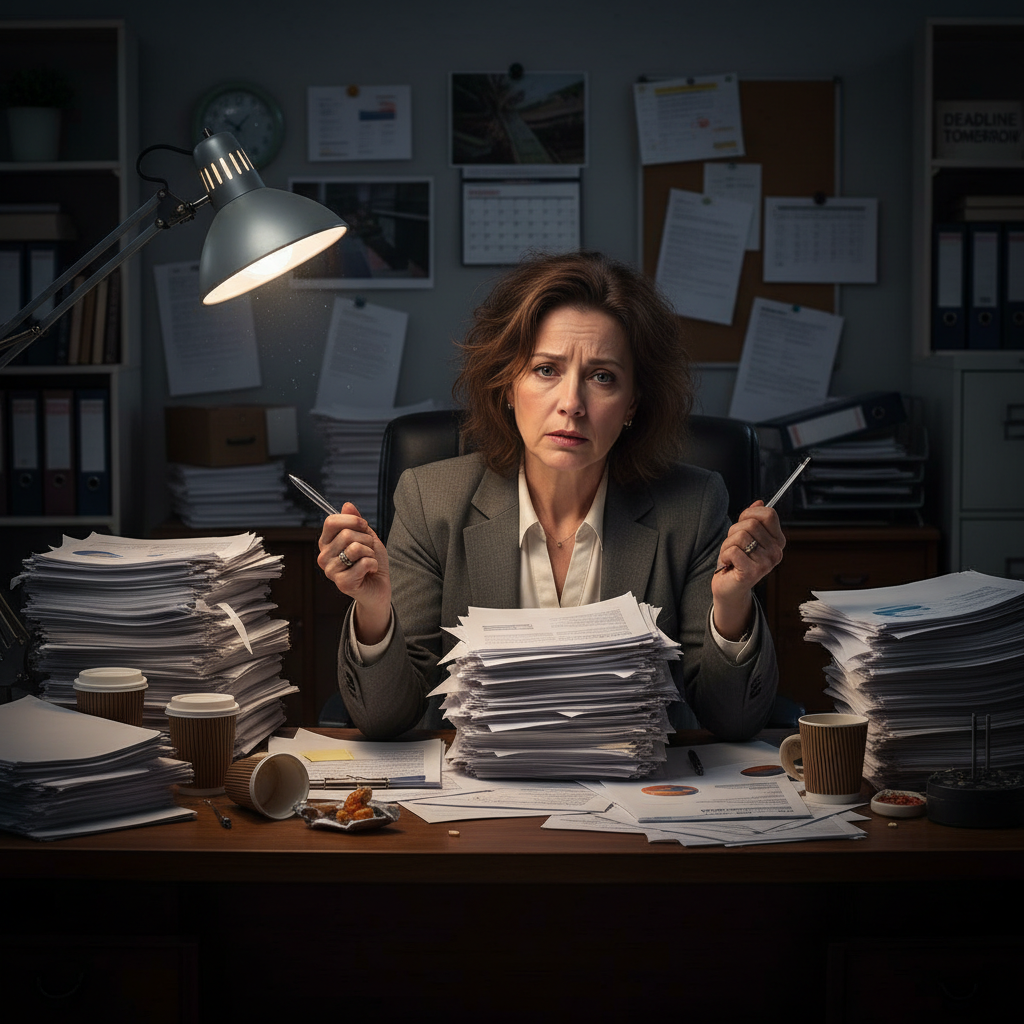 Alt text: Business owner overwhelmed by paperwork in dimly lit office, representing the need for document summarizer for business owners