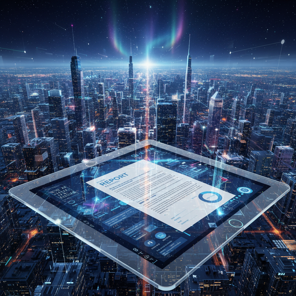 Alt text: Surreal photo of a paper report morphing into a digital skyline, symbolizing report summarization online.