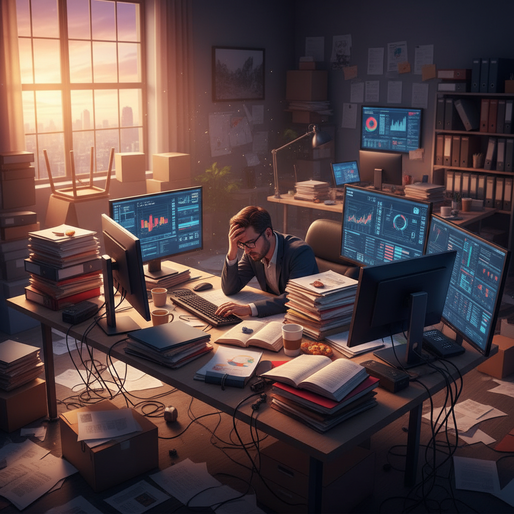 Alt text: Overwhelmed professional surrounded by paper stacks and digital screens needing online summarization.