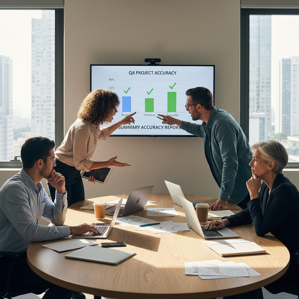 Alt: Multidisciplinary team debating the accuracy of a document summary.