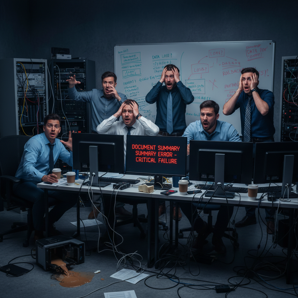 Alt: Technical team panicking after critical detail missed in summary.