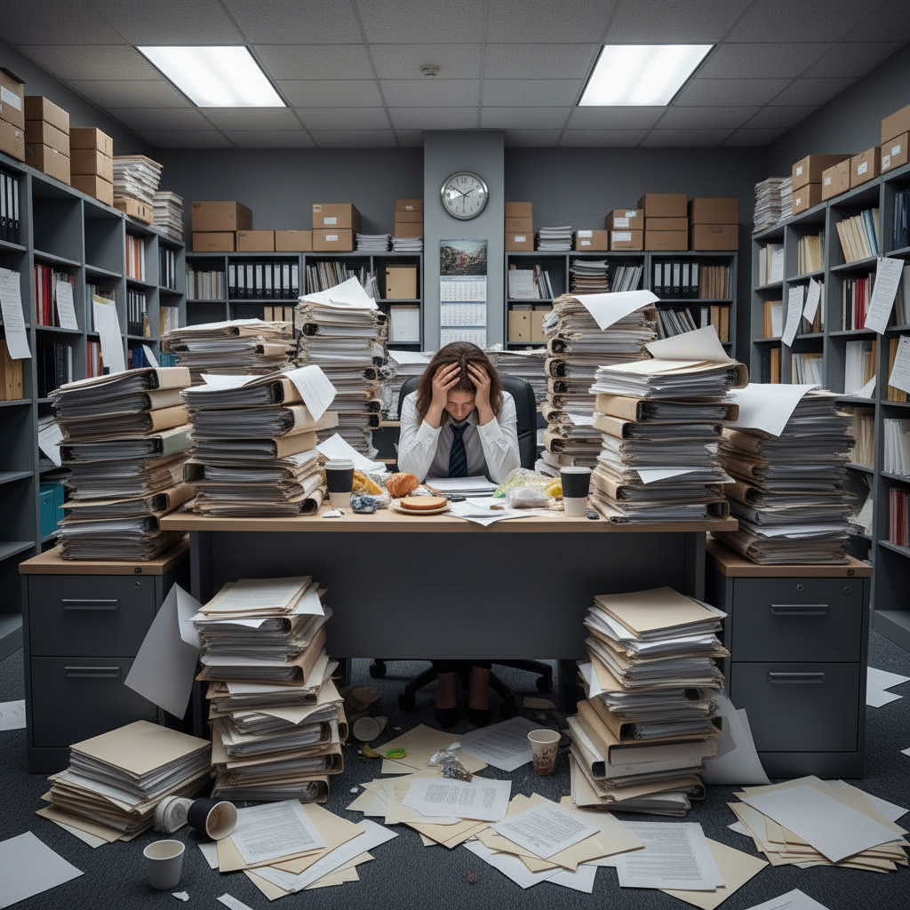 Alt: Office worker buried under piles of paper and digital files, highlighting text classification software challenges