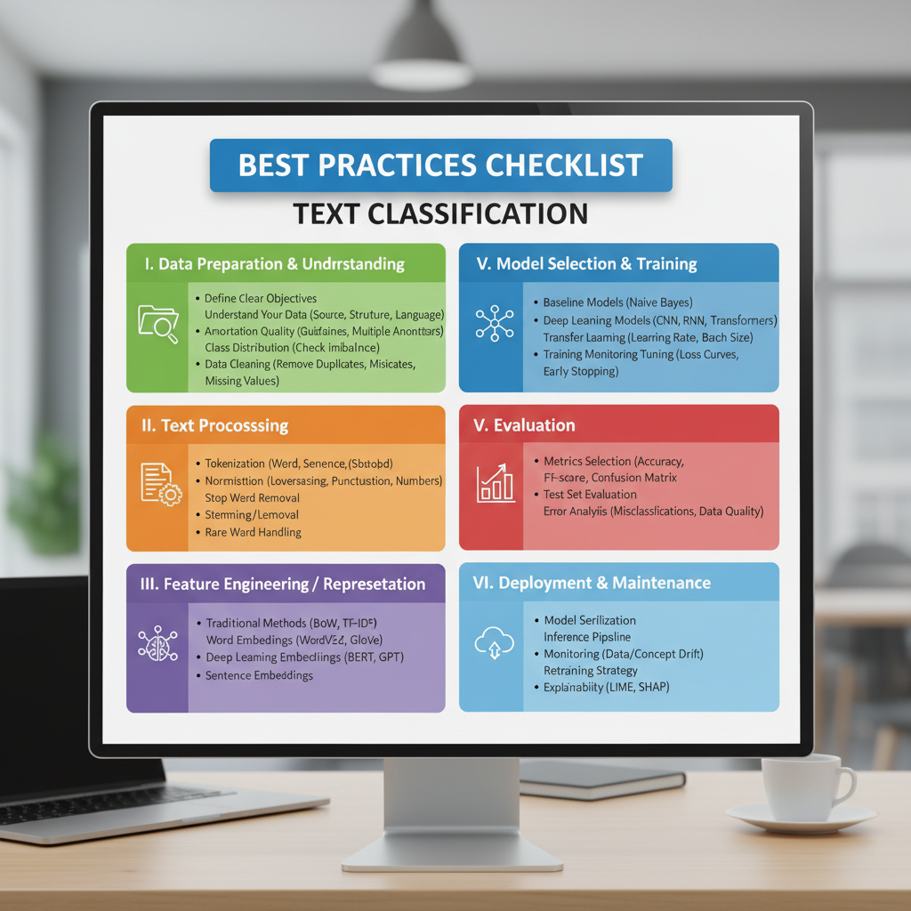 Alt: Illustrated checklist for text classification best practices with a professional team reviewing it