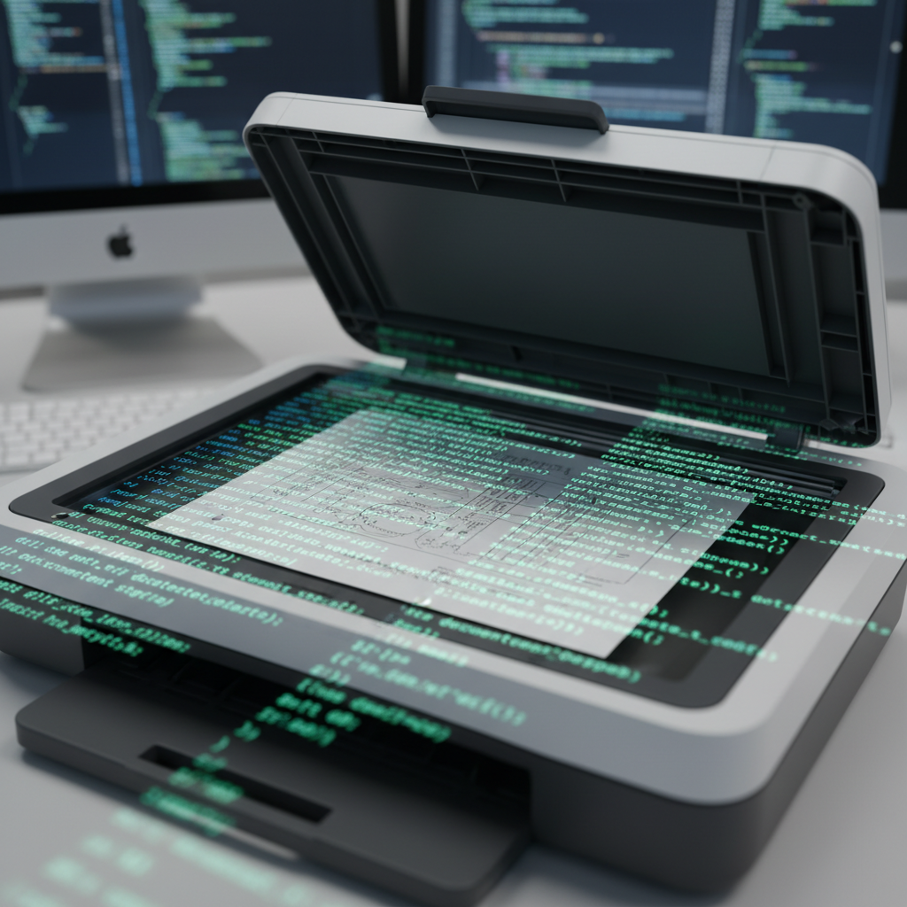 Alt text: High-tech document scanning process with code overlay, illustrating advanced text extraction software comparison.