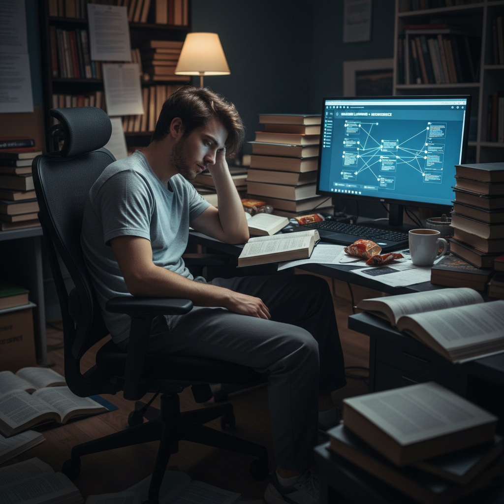 Alt text: Exhausted academic working late into the night on a complex literature review, surrounded by stacks of papers and digital screens with literature review tools.